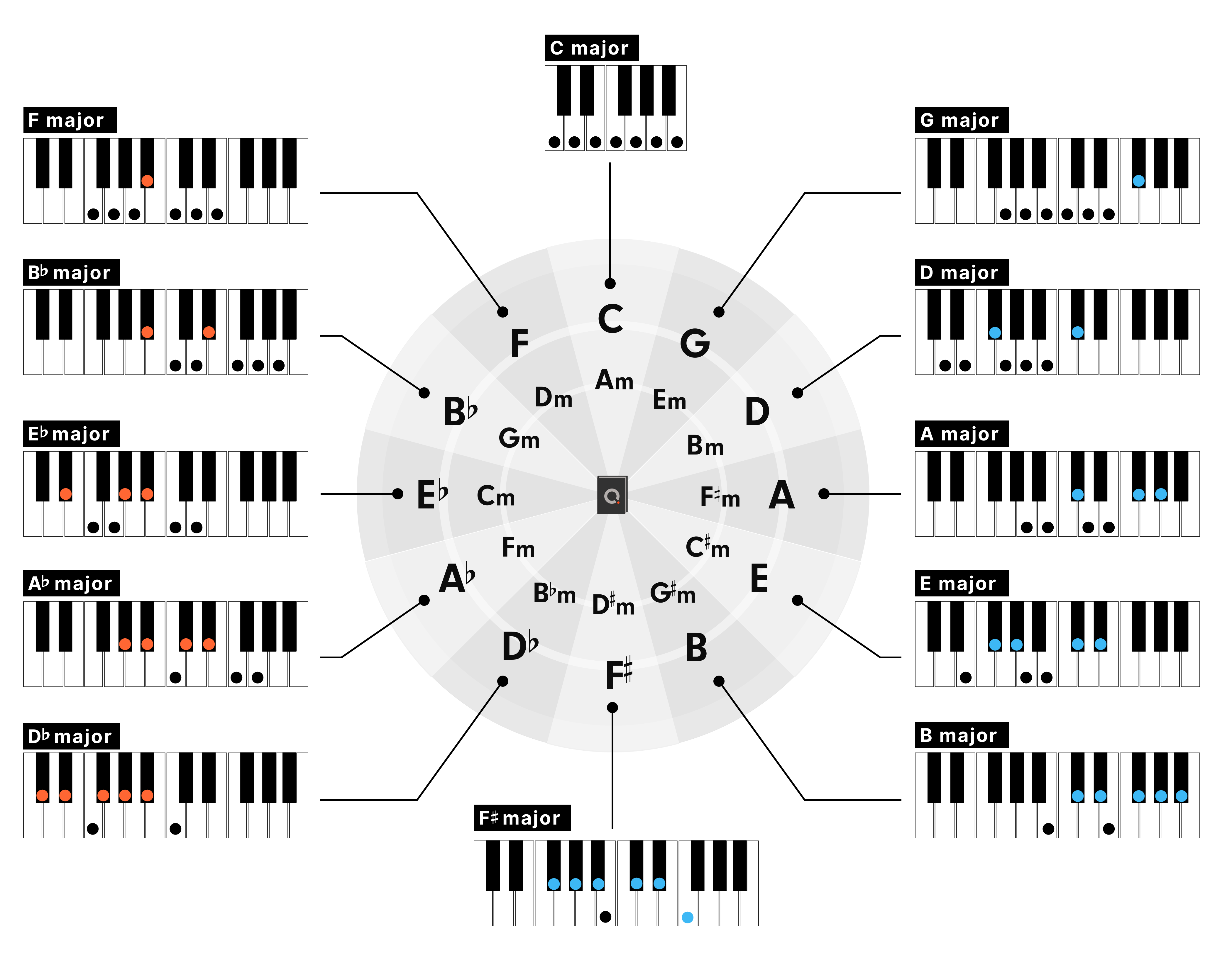 一个八度有12个音。7个白键和5个黑键。“五度圈”是将12种声音排列成类似于时钟的圆圈的图。有些地方的图时逆序的,但实质上是一样的。