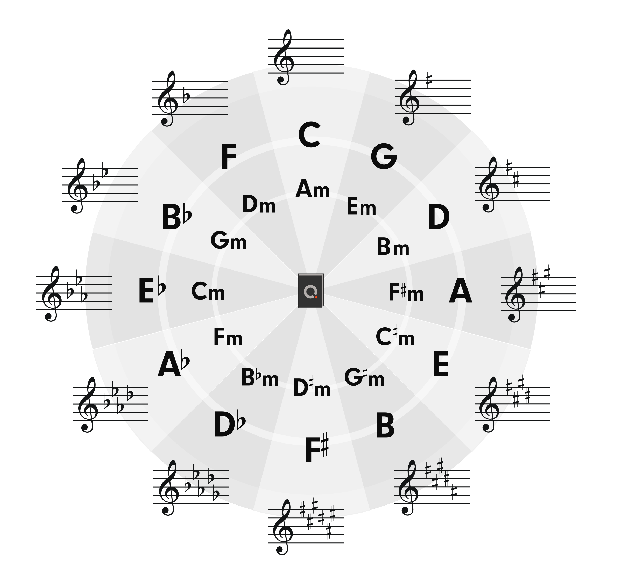 虽然看起来字母的排列是一个奇怪的顺序,但是“五度圈”实际上是所谓的“圆形音乐百科全书”,它提供了作曲时需要使用的各种信息!